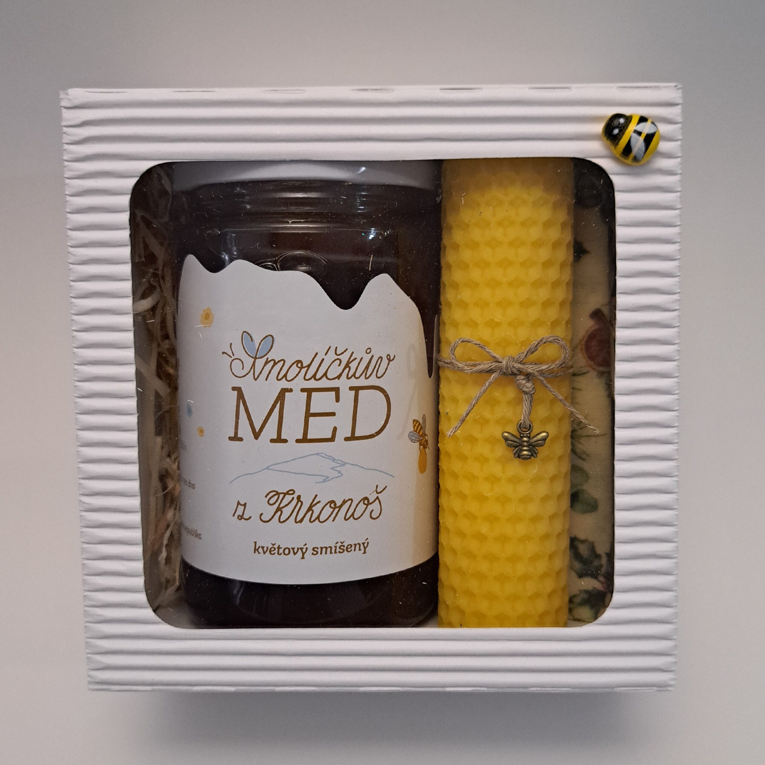 Voňavý med v roztomilém balení doplňuje ručně rolovaná svíčka z pravého včelího vosku – to vše uložené v roztomilém dárkovém balíčku, jako stvořeném pro milý dárek.